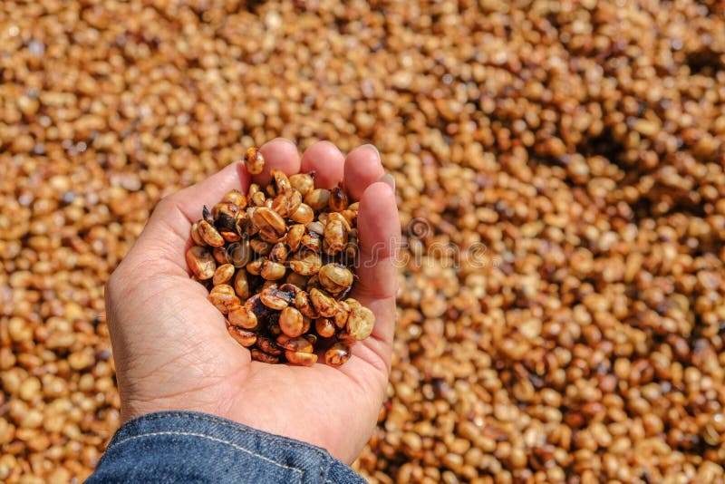 – Loại bỏ lá, cuống và quả hỏng. Xát vỏ ngoài để bỏ vỏ đỏ nhưng giữ lại lớp mucilage dính quanh hạt.